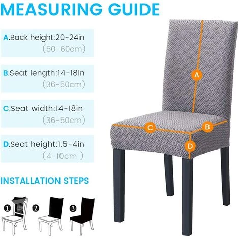 【S’adapte à la plupart des chaises.】Les housses de chaise de salle à manger conviennent aux chaises de taille : hauteur du dossier 50 ~ 60 cm (20-24 pouces), longueur du siège : 36 ~ 50 cm (14 ~ 18 pouces) ; Largeur du siège : 36 ~ 50 cm (14 ~ 18 pouces) ; Hauteur du siège : 4 ~ 10 cm (1,5 ~ 4 pouces). Comme nos photos le montrent. Veuillez mesurer vos chaises avant d’acheter pour garantir le meilleur ajustement. CHAISE NON INCLUSE.
