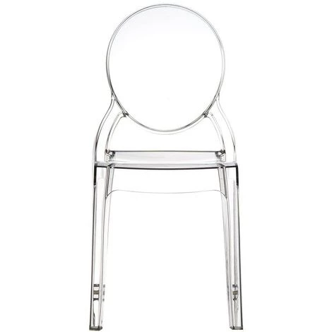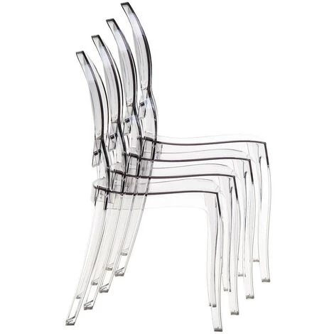 Inspirées d’un modèle classique avec le dossier arrondi, ces chaises en polycarbonate transparent sont adaptées à une utilisation à l’intérieur comme à l’extérieur, en raison de leur résistance aux rayons UV.