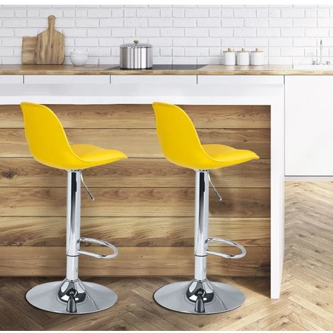 Avec leur design scandinave, ces 2 chaises hautes de bar ultra-tendances apporteront une ambiance à la fois contemporaine et chaleureuse à votre intérieur !Idéales dans une salle à manger ou une cuisine , ces chaises hautes confortables apporteront une touche déco très chic. Elles sont réglables en hauteur grâce à leur vérin à gaz afin de s’adapter à tous les plans de travail, bars et tables hautes. Très stable avec son socle rond de 38,5 cm, chaque tabouret possède un repose-pied en métal large pour garantir un maximum de confort. Pratiques, Ils pivotent à 360 degrés. Ces 2 tabourets design offrent une assise confortable avec leur haut dossier courbé en polypropylène et leur assise rembourrée en mousse.Dimensions des tabourets KARLDimensions totales : Longueur 39 cm x largeur 42 cm x 104 hauteur (dossier compris)Dimensions de l’assise : Longueur 38.5 cm x profondeur 33 cm x hauteur du dossier 24 cmHauteur de l’assise réglable : 63 à 84 cmVendu en lot de 2 tabourets coloris jauneDécouvrez également tous nos autres coloris disponibles sur notre boutique en ligne :- Lot de 2 tabourets de bar KARL design noir- Lot de 2 tabourets de bar KARL design blanc- Lot de 2 tabourets de bar KARL design gris- Lot de 2 tabourets de bar KARL design rouge- Lot de 2 tabourets de bar KARL design bleu canard