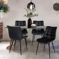 Descriptif des chaises MADY en PU noirVous recherchez des chaises modernes et élégantes pour meubler votre salle à manger ? Avec leur design contemporain aux lignes épurées, les chaises MADY noires apporteront une ambiance cosy et chaleureuse à votre intérieur.Leur assise large vous garantira un confort absolu pour tous vos repas et vous permettra de profiter pleinement de ces moments de convivialité. Leur dossier d’une hauteur de 46 cm apporte un soutien supplémentaire à votre colonne vertébrale.Leurs 4 pieds en métal noir mat leur assurent robustesse et stabilité, tout en soulignant le look résolument moderne et design de ces chaises de salle à manger.Il ne vous reste plus qu’à vous installer confortablement autour de la table !Dimensions des chaises MADY en PU noirDimensions totales : Longueur 46 x largeur 62,5 x Hauteur 82 cmDimensions assise : Longueur 46 x largeur 44 x Hauteur 46 cmPieds en métal noir matStructure d’assise en boisRevêtement en veloursVendues en lot de 4A monter soi-mêmeModèle disponible dans d’autres coloris :- Chaises velours MADY gris foncé- Chaises velours MADY bleu- Chaises velours MADY gris clair- Chaises velours MADY mix color bleu, gris clair, gris foncé, jauneRetrouvez l’ensemble de nos chaises de salle à manger sur notre boutique en ligne !
