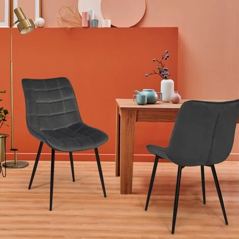 Vous recherchez des chaises modernes et élégantes pour meubler votre salle à manger ? Avec leur design contemporain aux lignes épurées, les chaises MADY en velours gris apporteront une ambiance cosy et chaleureuse à votre intérieur.Leur assise en velours, large et matelassée, vous garantira un confort absolu pour tous vos repas et vous permettra de profiter pleinement de ces moments de convivialité. Le dossier d’une hauteur de 46 cm apporte un soutien supplémentaire à votre colonne vertébrale.Leurs 4 pieds en métal noir mat leur assurent robustesse et stabilité, tout en soulignant le look résolument moderne et design de ces chaises de salle à manger.Il ne vous reste plus qu’à vous installer confortablement autour de la table !Dimensions des chaises MADY en velours grisDimensions totales : Longueur 46 x largeur 62,5 x Hauteur 82 cmDimensions assise : Longueur 46 x largeur 44 x Hauteur 46 cmPieds en métal noir matStructure d’assise en boisRevêtement en veloursVendues en lot de 4A monter soi-mêmeModèle disponible dans d’autres coloris :- Chaises velours MADY bleu- Chaises PU MADY noir- Chaises velours MADY gris clair- Chaises velours MADY mix color bleu, gris clair, gris foncé, jauneRetrouvez l’ensemble de nos chaises de salle à manger sur notre boutique en ligne !