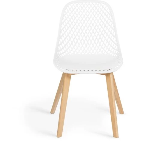 Description du lot de 4 chaises Mandy blanchesVous êtes à la recherche de chaises design avec une assise qui soit aussi belle que confortable ? Choisissez notre modèle Mandy ! Le dossier ajouré des chaises apportera au modèle un style graphique très en vogue en ce moment. Que vous choisissiez de les installer dans votre salle à manger, votre cuisine ou encore votre bureau, ces chaises scandinaves blanches trouveront leur place à coup sûr dans n’importe laquelle des pièces de votre maison.En plus d’apporter une touche de modernité à votre pièce, elles offrent un confort des plus agréables. Le dossier de ces chaises en polypropylène apportera flexibilité et solidité au modèle. Très stables, elles disposent de 4 pieds en bois de hêtre aux finitions travaillées.De couleur blanche, elles s’accorderont à tous les styles d’intérieur, et s’adapteront à votre mobilier. De plus, leur pieds en bois de hêtre apporteront du cachet à l’ensemble de la chaise.Profitez d’un design tendance et d’un petit prix avec ce joli lot de 4 chaises.Dimensions du lot de 4 chaises Mandy- Dimensions totales : Longueur 54 cm x largeur 56 cm x hauteur 86 cm- Largeur d’assise : 46 cm- Hauteur d’assise : 46 cm- Vendues en lot de 4 – Coloris blanc- Dossier en polypropylène- Pieds en bois de hêtreDécouvrez tous nos autres modèles de chaises scandinaves sur notre boutique en ligne !