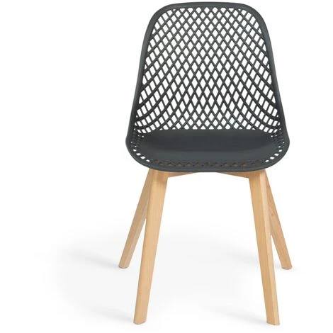 Description du lot de 4 chaises Mandy grisesVous êtes à la recherche de chaises design avec une assise qui soit aussi belle que confortable ? Choisissez notre modèle Mandy ! Le dossier ajouré des chaises apportera au modèle un style graphique très en vogue en ce moment. Que vous choisissiez de les installer dans votre salle à manger, votre cuisine ou encore votre bureau, ces chaises scandinaves grises trouveront leur place à coup sûr dans n’importe laquelle des pièces de votre maison.En plus d’apporter une touche de modernité à votre pièce, elles offrent un confort des plus agréables. Le dossier de ces chaises en polypropylène apportera flexibilité et solidité au modèle. Très stables, elles disposent de 4 pieds en bois de hêtre aux finitions travaillées.De couleur grise, elles s’accorderont à tous les styles d’intérieur, et s’adapteront à votre mobilier. De plus, leur pieds en bois de hêtre apporteront du cacher à l’ensemble de la chaise.Profitez d’un design tendance et d’un petit prix avec ce joli lot de 4 chaises.Dimensions du lot de 4 chaises Mandy- Dimensions totales : Longueur 54 cm x largeur 56 cm x hauteur 86 cm- Largeur d’assise : 46 cm- Hauteur d’assise : 46 cm- Vendues en lot de 4 – Coloris gris- Dossier en polypropylène- Pieds en bois de hêtreDécouvrez tous nos autres modèles de chaises scandinaves sur notre boutique en ligne !