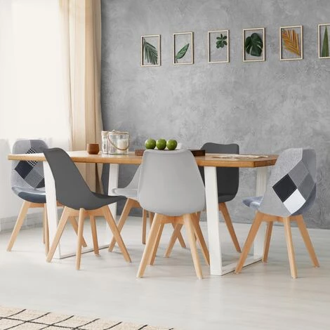 Descriptif des chaises scandinaves mix color et patchworks noirs, gris et blancsVous souhaitez aménager votre séjour, salle à manger ou cuisine avec des chaises gris foncé, gris clair et patchworks avec des pieds bois au look scandinave minimaliste ? Découvrez ces 6 chaises scandinaves proposées à prix promo !Ultra confortables grâce à leur dossier ergonomique et leur assise rembourrée, ces chaises nordiques équipées de 4 pieds offrent une parfaite stabilité. De plus, le dossier des chaises est flexible avec une forme courbée afin de s’adapter à chaque morphologie et offrir un confort d’assise idéal…Avec leurs pieds en bois de hêtre aux finitions travaillées, ces chaises scandinaves avec coussin vont s’harmoniser avec tout type d’intérieur ! L’imprimé patchwork en tissu polyester est agréablement doux au toucher et très tendance, il va apporter une touche de sophistication à votre décoration. Associées à du mobilier aux couleurs neutres, vives ou pastel, ces chaises nordiques vont réchauffer l’atmosphère de votre salon !À la recherche d’un lot de chaises scandinaves avec pied bois pour apporter une touche de modernité à votre intérieur ? Laissez-vous séduire par ce lot de chaises scandinaves original proposées à prix tout doux !Dimensions des 6 chaises scandinavesDimensions totales des chaises patchworks : L.44 cm x l.54 cm x H.82 cmDimensions totales des chaises scandinaves 4 couleurs : L.48 cm x l.60 cm x H.80 cm- Largeur extérieure entre deux piétements : 23,5 / 43,5 cm- Vendues en lot de 6- Coloris gris foncé, gris clair et patchworks- Dossier en polypropylène- Pieds en bois de hêtreDécouvrez toutes nos chaises SARALaissez-vous tenter par les meubles de notre collection scandinave.
