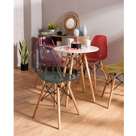 Cette jolie chaise transparente au design des années 50 vous séduira sûrement par son style et son aspect. Son assise en polycarbonate transparent s’harmonise parfaitement avec ses pieds en hêtre massif clair combiné avec de l’acier noir. Particulièrement esthétique, elle ajoutera une touche scandinave à votre pièce.Hauteur totale: 82,5 cm.Profondeur d assise: 36 cm.Largeur d’assise: 46 cm.Hauteur à l’assise: 42 cm.Largeur du dossier: 44 cm.Hauteur du dossier: 42 cm.Hauteur des jambes: 42 cm.Largeur des Jambes: 39,5 cm.Profondeur des Jambes: 40 cm.Poids: 3,8 kg.Matière d assise: Propylène.Matière structure: Bois de hêtre et acier renforcé.Lieu: Intérieur et extérieur.Usage: Professionnel et domestique.Poids qu il supporte: Jusqu à 150 kilos.Empilable: Non.Nécessite un assemblage: Oui.Fabriqué conformément à la norme de sécurité en vigueur: EN 581:2017.Garantie: 2 ans.Nous ne livrons pas en Corse.