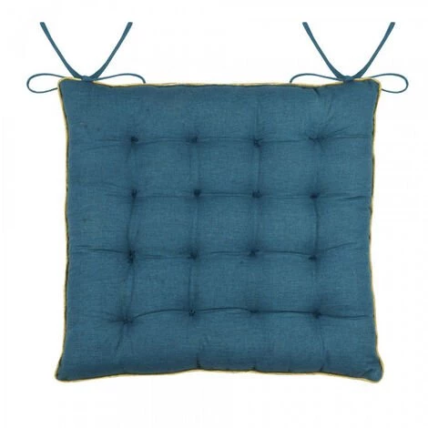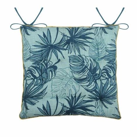 Couleur : bleu. Dimensions : environ 40 x 40 cm. Matière : 100 % coton. Finition : non déhoussable. Attaches avec des nouettes. Imprimé : recto motif feuillage verso uni.