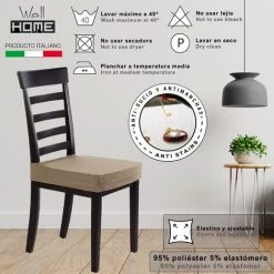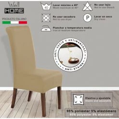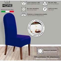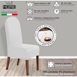 Ensemble de couvertures de chaiseStyle et élégance:Convient à toutes les chaises avec 40 à 60 cm de haut et siège de 35 à 50 cm de large et profondémentGrâce à un traitement résistant aux spots spéciaux, votre chaise sera complètement protégée, alors que grâce à la composition super élastique particulière du tissu, vous habillez vos chaises avec facilité et élégance.Composition: 95% de polyester et 5% d’élastomère.Instructions de lavage:Ils peuvent être lavés dans la machine à laver et sécher dans la sécheuse100% de fabrication en Italie