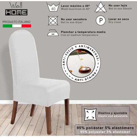 Ensemble de couvertures de chaiseStyle et élégance:Convient à toutes les chaises avec 40 à 60 cm de haut et siège de 35 à 50 cm de large et profondément.Grâce à un traitement résistant aux spots spéciaux, votre chaise sera complètement protégée, alors que grâce à la composition super élastique particulière du tissu, vous habillez vos chaises avec facilité et élégance.Composition: 95% de polyester et 5% d’élastomère.Instructions de lavage:Ils peuvent être lavés dans la machine à laver et sécher dans le sèche-linge.100% fabriqué en Italie