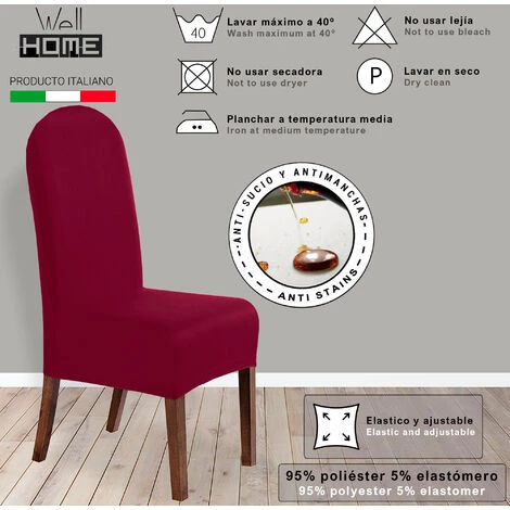 Ensemble de couvertures de chaiseStyle et élégance:Convient à toutes les chaises avec 40 à 60 cm de haut et siège de 35 à 50 cm de large et profondément.Grâce à un traitement résistant aux spots spéciaux, votre chaise sera complètement protégée, alors que grâce à la composition super élastique particulière du tissu, vous habillez vos chaises avec facilité et élégance.Composition: 95% de polyester et 5% d’élastomère.Instructions de lavage.Ils peuvent être lavés dans la machine à laver et sécher dans le sèche-linge.100% fabriqué en Italie