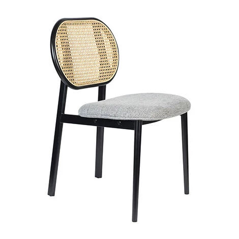 Matière : revêtement tissu 100% polyester, dossier en rotin dans une structure laquée en hêtre massif, rembourrage en mousse polyuréthane de densité 28 kg/m3, structure en métal et couvre-pieds en plastique